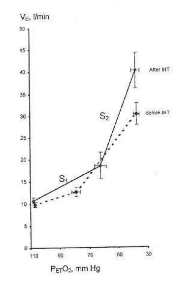 Hypocapnia occurs with altitude acclimatization and ventilation remains increased for days after the subjects return to sea level. By contrast, in the two above studies, eucapnia was maintained during the hypoxic exposures and neither normoxic venilation nor normoxic PC02 was altered by IHT, suggesting that only the hypoxemia and not changes in PC02 (or pH) were involved.