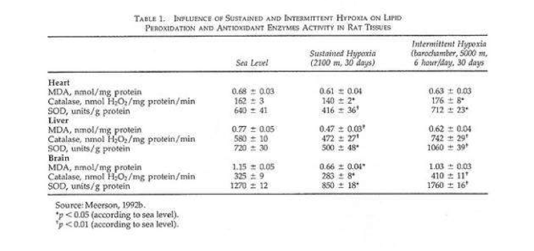 In a recent study rats were given shorter hypoxic exposures: 15 min five times daily for 14 d (Kurhalyuk and Serebrovskaya, 2001). When they were subsequently challenged by exposure to 7% oxygen, blood catalase and glutathione reductase activity were increased and malon dialdehyde concentration was half that of non-IHT controls. The findings were consistent with the concept that intermittent hypoxia stimulates increased antioxidant defenses.