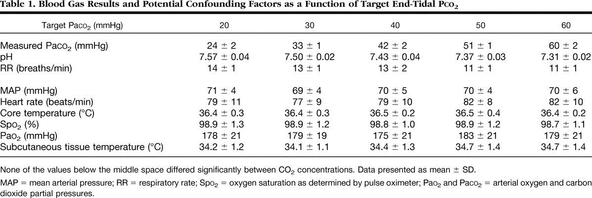 Methods: General anesthesia was induced with propofol and maintained with sevoflurane in 30% oxygen in 10 healthy volunteers. Subcutaneous tissue oxygen tension (Psqo2) was recorded from a subcutaneous tonometer. An oximeter probe on the upper arm measured muscle oxygen saturation. Cardiac output was monitored noninvasively. Paco2 was adjusted to 20, 30, 40, 50, or 60 mmHg in random order with each concentration being maintained for 45 min.
